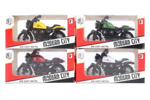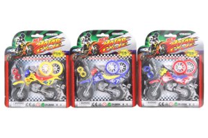 Závodní motorka. Délka 11 cm. Volná kola. 4 varianty - modrá, zelená, červená, žlutá.