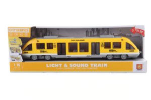 Plastový vlak na baterie. Vlak vydává zvuky a svítí.