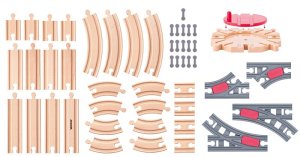 Vláčkodráha na baterie. Balení obsahuje 19 dílů.