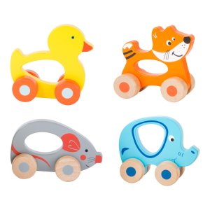 Dřevěná pískací zvířátka na kolečkách - série 4ks - žirafa, žabka, myška, ovečka.