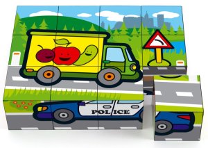 Dřevěné kostky s obrázky dopravních prostředků.