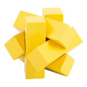 Inovovaná stavebnice skládající se z různých tvarů a velikostí dřevěných dílků v barevném provedení žluto-oranžovém.