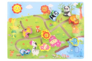 Dřevěné bludiště se zvířátky. Rozměry cca 30 x 22,5 x 2,5 cm.