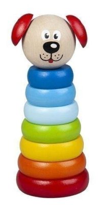 Poskládejte pyramidu z dřevěných kroužků a na vrcholek nasaďte hlavičku pejska, 8 ks.Rozměr krabice: 17,5 x 6,5 x 6,5 cmVhodné od 1 roku