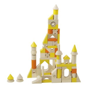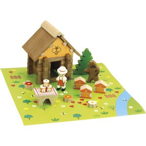 Dřevěná stavebnice v kyblíku. Obsahuje 56 dílků a obrázkovou brožuru s návody na stavění.