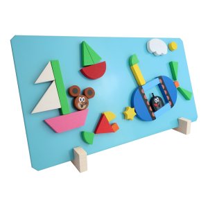 Na kovovou tabulku si děti mohou skládat magnetické dílky a sestavit tak nepřeberné množství obrázků s motivem Krtečka a jeho kamarádky Myšky.
