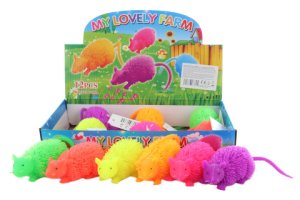 Gumová střapatá myš. Uvnitř je svítící kulička, která bliká.