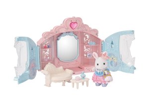 Hrací sada Sylvanian Families Stylový šatník obsahuje krásný třpytivý kočár, doplňky a figurku holčičky z rodiny Sněžných králíků oblečenou do princeznovských šatiček.
