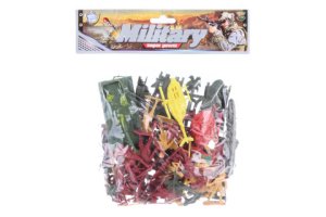 Vojáčci v sáčku. Balení obsahuje dvě barevné sady figurek o velikosti cca 5 cm, opevnění, tank, vrtulník a další doplňky.