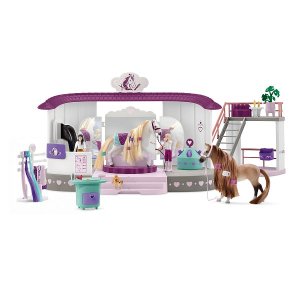 Salon krásy pro koně s širokou škálou příslušenství, v balení 2 pohyblivé postavičky, 2 figurky koní s jemnou hřívou.