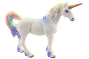 Plastový jednorožec o velikosti cca 15 x 11 x 4 cm.