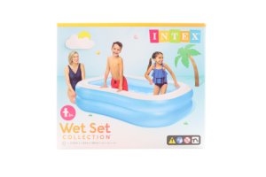 Oválný modrobílý nafukovací bazén. Velikost: 203 x 152 x 48 cm. Objem vody: 540 litrů.