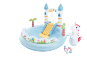 Hrací centrum Jednorožčí hrad je nafukovací herní set určený pro děti od dvou let, který kombinuje zábavu s možností osvěžení v horkých letních dnech.