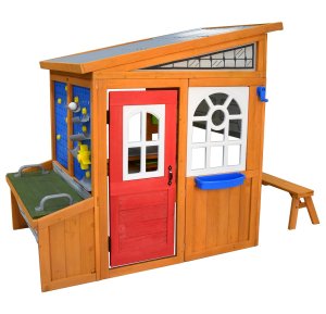 Domeček pro malého zahradníka se spoustou herních prvků a příslušenství, např. velký truhlík, mřížka na stěnu s květináči, krmítko, okap s konvičkou a další.