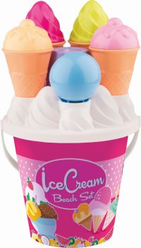 Plastová sada na písek se zmrzlinovým motivem zabaví děti na písčité pláži i v parku na pískovišti.