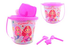 Dětský kovový kyblík v růžové barvě s obrázkem s dětským motivem.