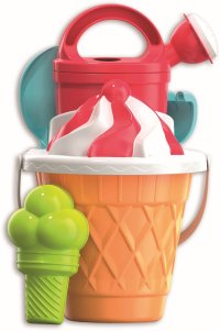 Pískový set výroba zmrzliny obsahuje kyblík , sítko, 3 kornouty, 3 kopečky zmrzliny a naběračku na zmrzlinu.
