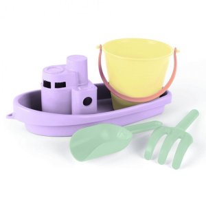 Sada na písek obsahuje kyblík, hrabičky, lopatku a formičku ve tvaru hvězdičky.