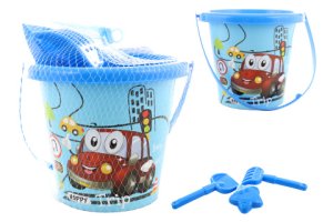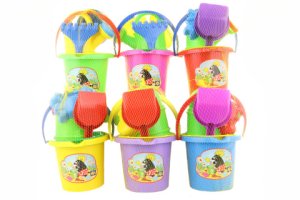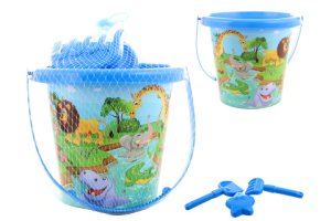Plastová sada na písek obsahuje kyblík, sítko, lopatičku, hrabičky, konvičku a bábovku.Věk 3+