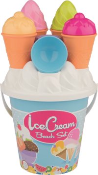 Sada na písek zabaví děti na písčité pláži i v parku na pískovišti. sada obsahuje: kyblík ve tvaru kornoutu o výšce 17cm, lopatku hrabičky, konvičku, bábovku ve tvaru zmrzliny a polevy a sítko