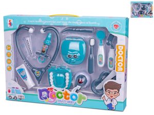 Doktorská sada obsahuje plastový stetoskop, otoskop, injekci, jmenovku a teploměr.