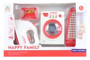 Sada přístrojů pro domácnost. Balení obsahuje žehličku, žehlící prkno, pračku a koš na prádlo.