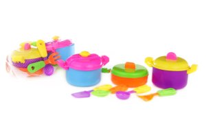Sada hrnců.Sada obsahuje dva hrnce cca 19 cm X 13 cm X 7 cm + pokličky ,pánev cca 23 cm s pokličkou a 4 ks kuchyńského nháčiní cca 15 cm.Věk 3+