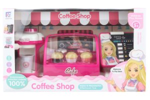 Velká kavárna s doplňky. Balení obsahuje kávovar, chladničku s dortíky a pokladnu.
