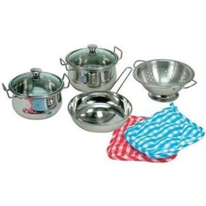 Rozměry: velký hrnec 20x11x4,5 cm, pánev 28x10x3 cm Věk: 3+ Materiál: kov, látka Obsahuje: 11 dílů