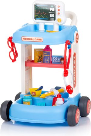 Vozík pro malé lékaře zahrnuje lékařský kufřík, stetoskop, infuzi a další příslušenství - stříkačku, teploměr, nůžky atd. pro zjištění zdravotního stavu pacienta.