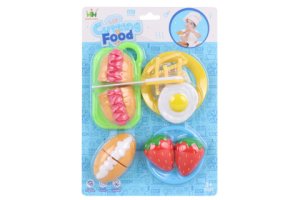 Plastová sada jídla obsahuje bagetu (jednotlivé ingredience lze na sebe skládat), párek v rohlíku, donut, sušenky, zmrzlinu, nápoj a další doplňky.