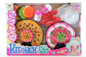 Plastová sada obsahuje koláč a dort na dílky, hamburger, slánku, pepřenku a náčiní.