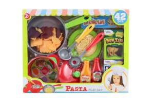 Plastová sada jídla a nádobí. Obsahuje hrnec s pokličkou, pánev, talíř, naběračky, těstoviny a další menší doplňky.