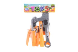 Plastové nářadí v sáčku. Balení obsahuje kladivo, klíč, šroubovák, kleště a pilku.