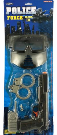 Policejní sada obsahuje pouta, průkaz, odznak, obušek a dále samopal, sluchátka, hodinky, píšťalku / 2 pistole, pouzdro, vysílačku.