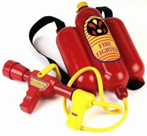 Malý hasič ke své práci potřebuje i hasící přístroj na záda.