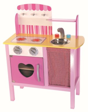 Dřevěná kuchyňka v růžových tónech od výrobce Trefl z řady dřevěných hraček, které podporují rozvoj dítěte.