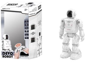 Robot na dálkové ovládání, pohyb všemi směry, plastové tělo, jednoduché ovládání, rozměry 40×22,5×14,2 cm.
