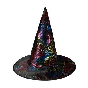 Kouzelný klobouk černé barvy zdoben barevnými magickými pavučinkami.