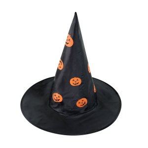 Úžasný čarodějnický klobouk v černé barvě s potiskem oranžových dýní.