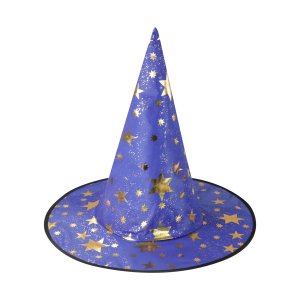 Úžasný čarodějnický klobouk v modré barvě s potiskem zlatých hvězdiček.