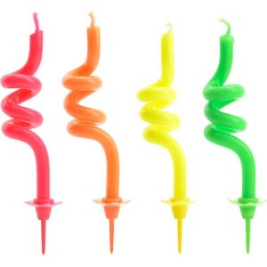 Svíčky na dort ve veselých barvách mají zajímavý zakroucený tvar.