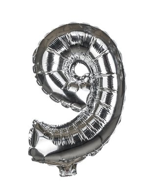 Balónek nafukovací fóliový číslo 9, je vysoký cca 30 cm, barevný mix: zlatá a stříbrná barva.
