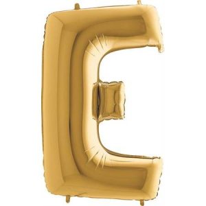 Zlatý balónek písmeno E. Balónek je vyrobený z pevné fólie.