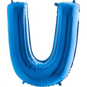 Modrý balónek písmeno U. Balónek je vyrobený z pevné fólie.