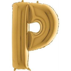 Zlatý balónek písmeno P. Balónek je vyrobený z pevné fólie.