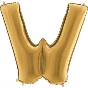 Zlatý balónek písmeno W. Balónek je vyrobený z pevné fólie.