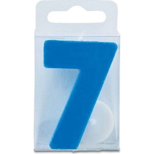 Svíčka modré barvy ve tvaru číslice 7, vysoká 4 centimetry.