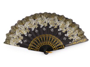 Textilní vějíř zdobí potisk motýlů, který je doplněný třpytivými glitry.