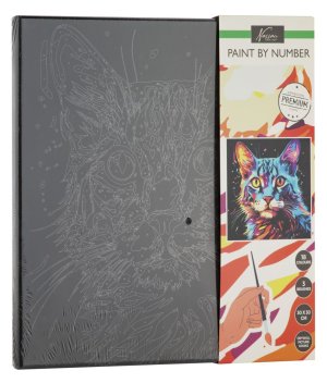 Kreativní sada pro milovníky zvířat a malování! Obrázek kočky na černém plátně si můžete jednoduše vybarvit podle čísel, která odpovídají jednotlivým barvám.